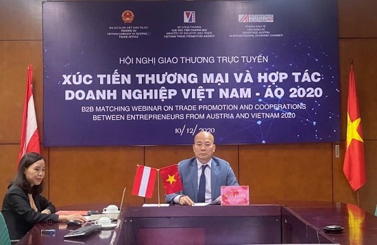 Ngày 10/12/2020, Cục Xúc tiến thương mại (XTTM – Bộ Công Thương) đã phối hợp với Thương vụ - Đại sứ quán Việt Nam tại Áo và Phòng Kinh tế Liên bang Áo tổ chức Hội nghị giao thương trực tuyến xúc tiến thương mại và hợp tác doanh nghiệp Việt Nam – Áo 2020.