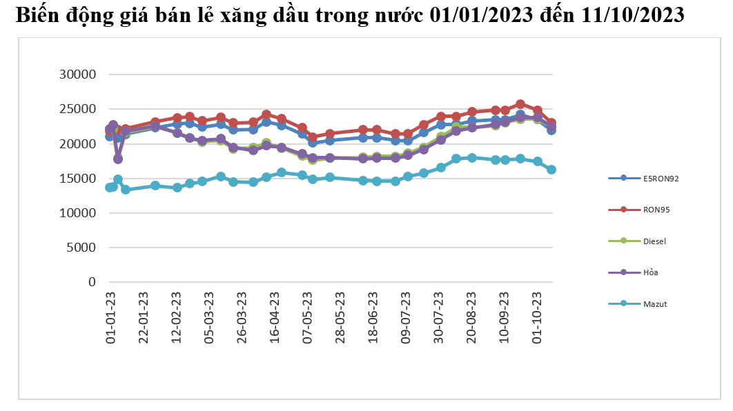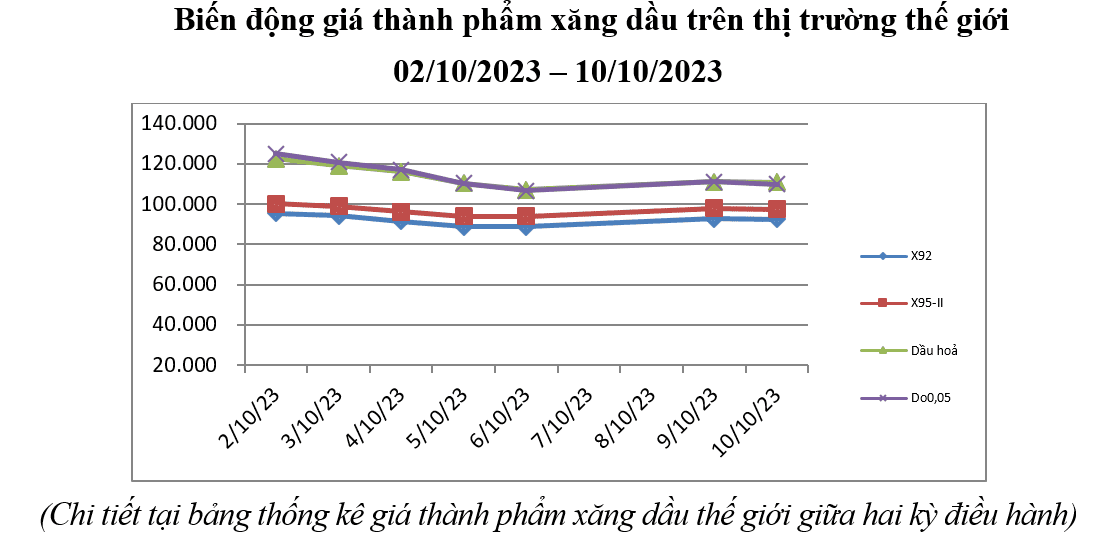 Bình quân giá thành phẩm xăng dầu thế giới giữa kỳ điều hành giá ngày 02/10/2023 và kỳ điều hành ngày 11/10/2023 là: 92,040 USD/thùng xăng RON92 dùng để pha chế xăng E5RON92 (giảm 9,454 USD/thùng, tương đương giảm 9,32% so với kỳ trước); 97,021 USD/thùng xăng RON95 (giảm 9,811 USD/thùng, tương đương giảm 9,18% so với kỳ trước); 113,919 USD/thùng dầu hỏa (giảm 8,896 USD/thùng, tương đương giảm 7,24% so với kỳ trước); 114,460 USD/thùng dầu điêzen (giảm 8,904 USD/thùng, tương đương giảm 7,22% so với kỳ trước); 484,764 USD/tấn dầu mazut 180CST 3,5S (giảm 45,687 USD/tấn, tương đương giảm 8,61% so với kỳ trước).