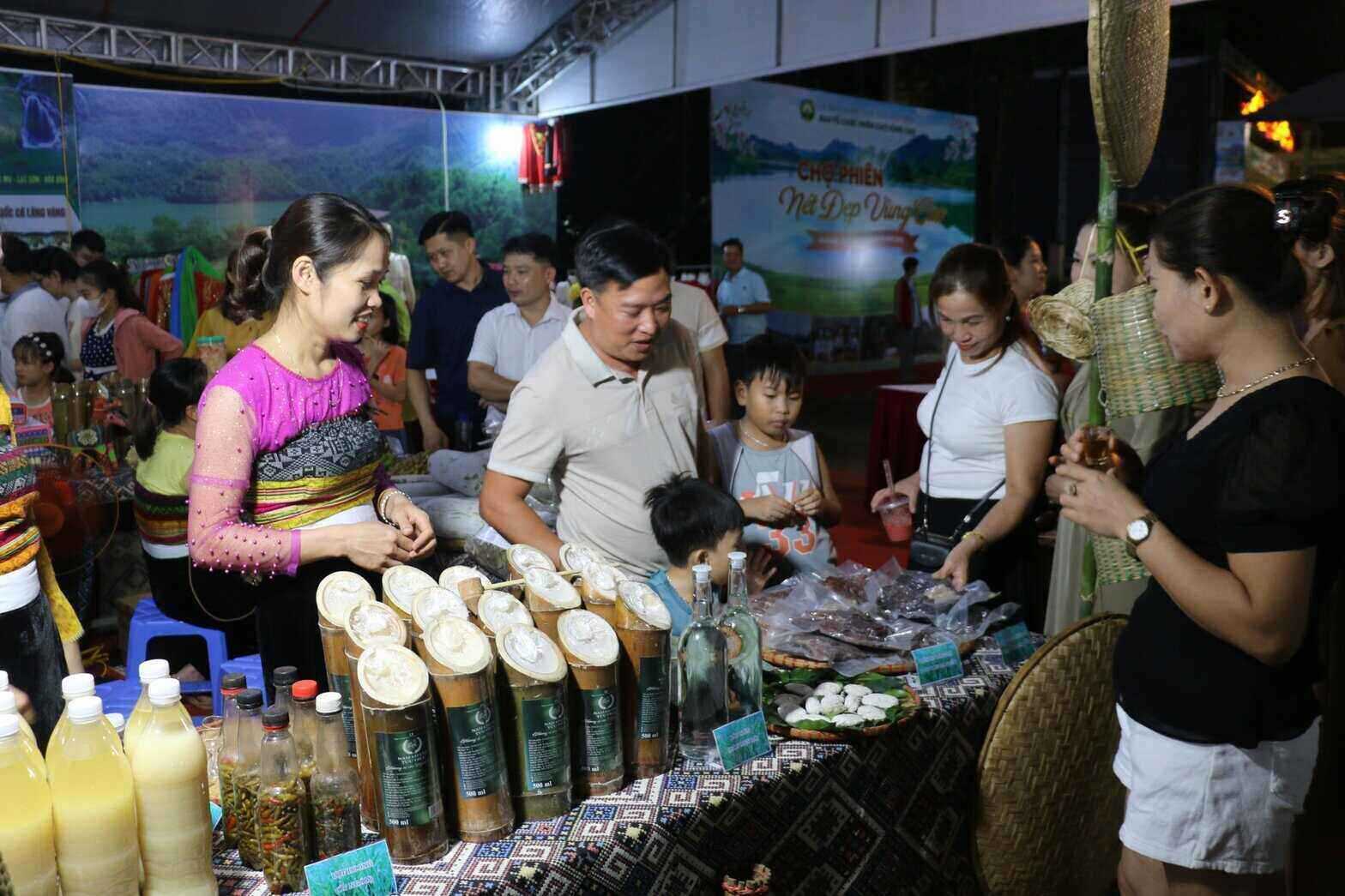 Tại phiên chợ, những sản phẩm độc đáo của các huyện được trưng bày và thu hút du khách tham quan, mua sắm, như: Cơm lam, dưa nương, chuối rừng, măng rừng… là những sản vật đặc trưng của núi rừng Hoà Bình. Và cả những sản phẩm OCOP các địa phương như: Mật ong, gạo nếp nương, cao xạ đen, cà gai leo...