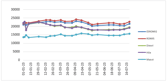 Biến động giá bán lẻ xăng dầu trong nước 01/01/2023 đến 21/7/2023