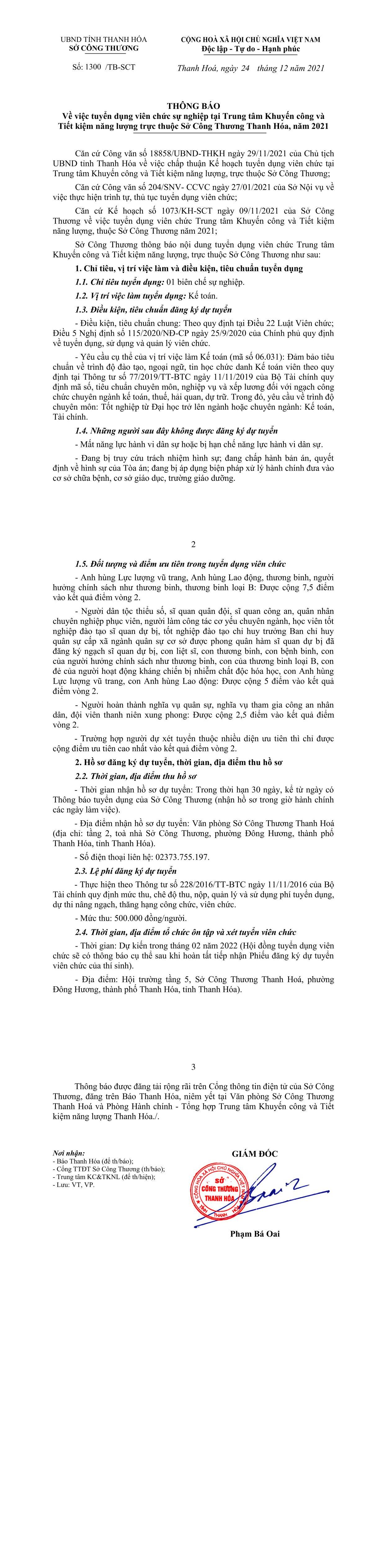 Về việc tuyển dụng viên chức sự nghiệp tại Trung tâm Khuyến công và Tiết kiệm năng lượng trực thuộc Sở Công Thương Thanh Hóa, năm 2021